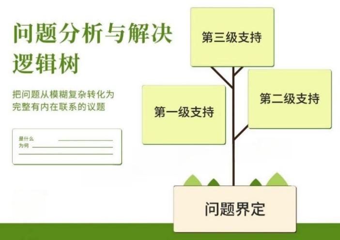 问题界定清楚后,再去运用逻辑树,一层一层进行剖解,寻找支持的论点和论据。最后再反过来验证当初的问题界定是否准确。