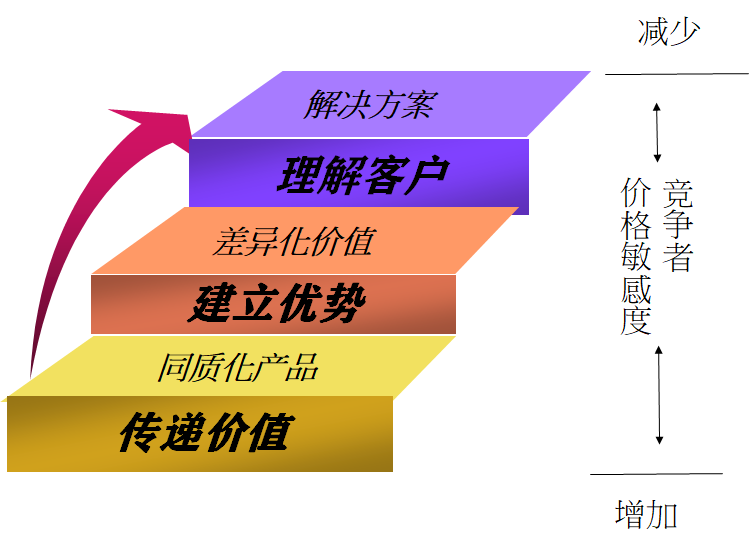 第一个层次:了解自己所在公司、产品和服务的优势,能准确无误地向客户传递价值。同质化竞争仍然会面对客户价格的压力。