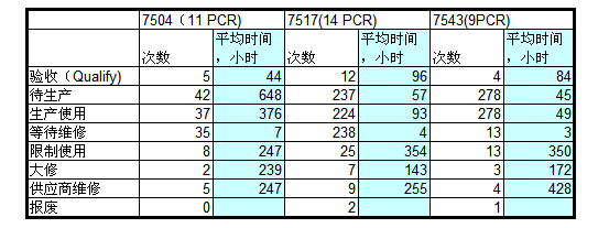 生产使用时间:是指一个PCR板从维修车间领用到退回维修车间这段时间。每次更换PCR板需要15~45分钟,这个时间与PCR板自身设计密切相关。这是一个主要的输入参数。体现了PCR板的性能。7504明显高于其他两种。从实际数据可以看出,超过20%的PCR板使用时间短于2个小时,小组成员在现场跟踪了1天的PCR更换过程。发现生产人员领用PCR后,需要在测试机上调整PCR板与机器接口,这个时间是不固定的,从15分钟到3个小时都有。如果始终不能正常测试,生产部就会归还该PCR板并更换新的PCR板。在正常测试开始后,如果产品测试良率下降,也要调整或者更换新的PCR板