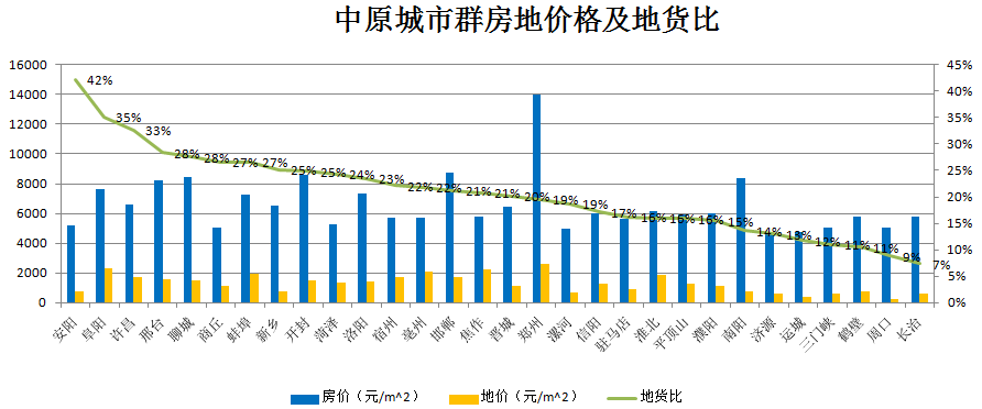 中原城市群房价平均涨幅为42%,地价平均涨幅为79%。房价涨幅高于城市群整体平均增幅的城市共有14个,分别为郑州、开封、洛阳、南阳、新乡、周口、信阳、濮阳、三门峡、聊城、菏泽、淮北、邢台、邯郸;地价涨幅高于城市群整体平均增幅的城市共有10个,分别为开封、洛阳、安阳、新乡、许昌、聊城、阜阳、蚌埠、邢台、邯郸。