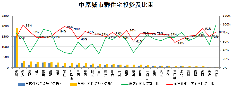2016年中原城市群住宅投资额为6512.5亿元,住宅投资额在均值253亿元以上的城市有7个,分别是郑州、洛阳、新乡、信阳、阜阳、蚌埠、邯郸。整个城市群住宅投资额占房地产投资额比重为74.79%,市区住宅投资占全市住宅投资的64.50%。市区住宅投资占比低于50%的城市有:安阳、商丘、周口、信阳、驻马店、菏泽、毫州,以上城市所辖县级城市房地产投资较为活跃,应重点关注。