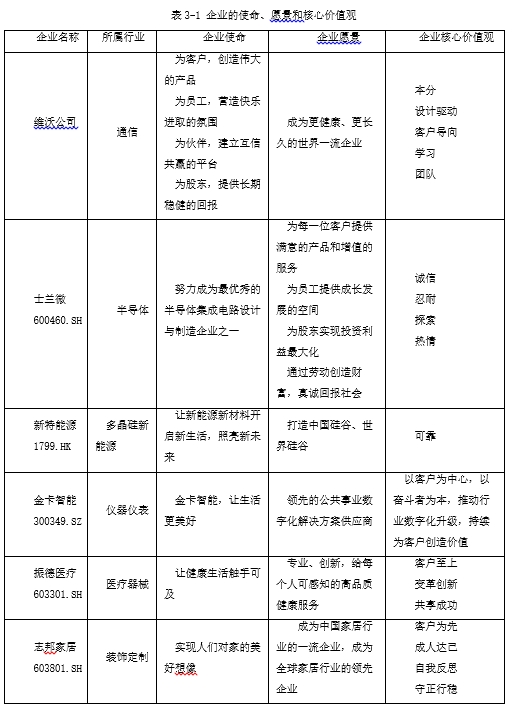 战略意图的五要素中,使命是回答企业做什么;愿景是回答通过长期奋斗企业希望自己达到怎样的高度;核心价值观是回答当企业和员工面临利益冲突时如何选择;使命、愿景和核心价值是回答企业的终极目标,这在某种意义上也代表企业创始人对哲学三问的思考。细观表3-1,维沃公司、新特能源、士兰微、志邦家居等多家企业,不约而同地将成为全球领先企业作为自己长期奋斗目标,而且通过他们的努力,当下已成为中国细分市场的领先者,正在向世界级优秀企业的道路上前行。这种以终为始的逆向思维模式,通过建立宏伟远景,凝聚奋斗力量,可以最广泛吸引最优秀人才,并激励组织里的每个人自动自发地为终极目标奋斗不息。