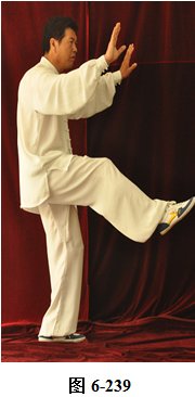 接上式,腰微含,向东南稍转,两手随腰外翻转向稍东南,变为横立掌,两手心均向内,成护胸腹之式。腰微含回转,朝向正东, 两手臂随之回转划一小圆,旋翻手心向下,腰向下沉,屈膝成半蹲式,两手臂随之下沉,成斜向前立掌。腰微上提两臂随之前撮,腰向左、右外撑,重心移于左腿,右膝微屈,两臂随腰左、右外撑划立圆。腰向下沉,两臂向下划至两膝旁,两腿随腰下沉,成半蹲状。腰上提,两臂随之上搂,双手成交叉状至面部前,重心立于左腿, 提右膝,抬右腿,腰向后微含,两臂随之向左右外开,两手旋翻掌心向外, 略宽于肩, 右脚尖随之向稍东南方慢慢踢出(见图6-233至6-239)。