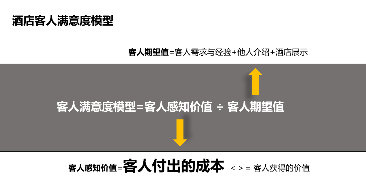 最终酒店要实现客人期望值较低,客人感知价值较高,客人满意度高,结果就是客人复购率高。
