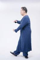 4.右脚涌泉一踩,将所有重量与重心慢慢移交给左脚。在移交重心的同时,双手反方向移动,左手臂掤出,向身体前方荡起至胸前三个拳头长的距离,右手由原来的胸前慢慢自然放下,手掌朝后,大拇指在裤腿缝处,中指微微翘起。脚停手停、手停脚停;一动无有不动、一静无有不静;此时上半身向着45度的东北方向,两手背自然保持美人手。
