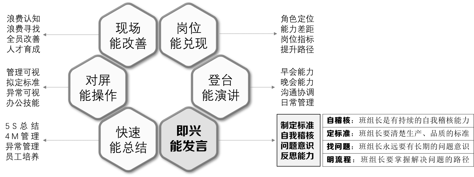 即兴能发言:基层班组长在班组长这个岗位上,必须要具备不断反思自己的能力,针对在自己管理的范围内,针对人、机、料、法、环五个要素拟定的标准,不断的遵守标准即维持能力,也要在日常的管理过程中,不断的自我稽核,强化问题意识,通过不断的解决问题,提升自己的管理能力,这样才能够针对日常管理的标准,有着强大的自我发言权,也知道如何进行发言即改进。