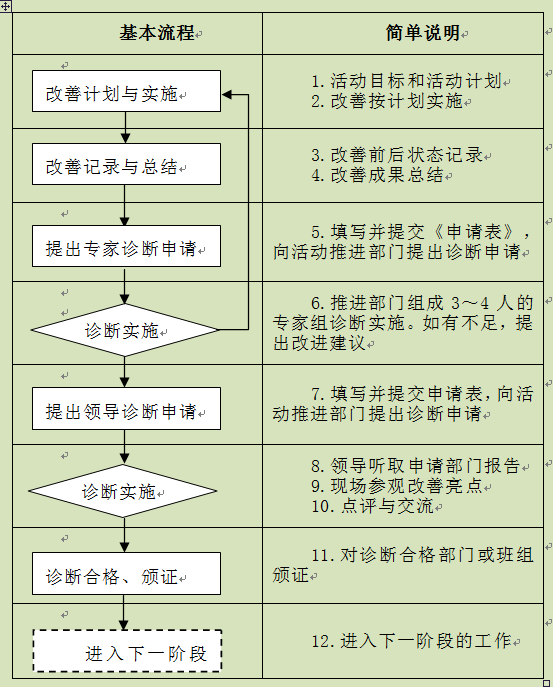 自主管理活动有5个活动步骤,而这5个步骤说到底就是5个不同的水准,因此,在申请诊断认证时,可以分步或合并提出诊断申请。下面具体说明诊断工作如何进行(如图2-15所示),供读者参考。