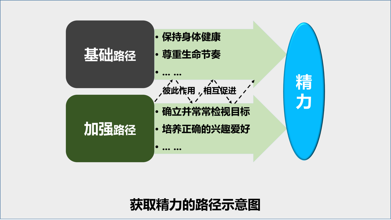 需要补充说明的是,获取精力的基础路径和加强路径事实上是彼此作用、相互促进的。打个不是很确切的比方:基础路径犹如汽车的发动机,加强路径类似为发动机加油。发动机再好,如果油是劣质的,也无法提供有效的动力。反过来,油再好,如果发动机本身的性能有问题,同样如此。