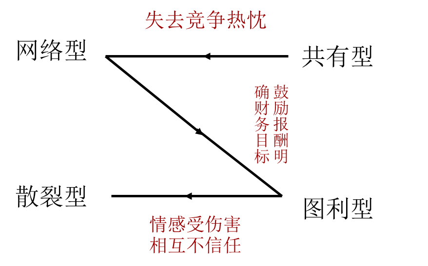 在网络型、散裂型、图利型和共有型四种文化类型之间,是可以随着企业组织内部或外部环境及条件的变化而发生改变的,具体的过程及模式如图5-5所示。