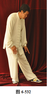 左云手:接上式,腰微拱,向右后旋转,右勾手变掌向右外棚, 左手在左肋旁随右掤势,自下向上划一小弧;腰微回转上提,身体微向左转,左手随之外旋翻,右手向下划。腰微后拱,重心落于右腿,右手掌落于右胯侧旁,掌心向内。左手内旋翻至左膝外侧,掌心向下,身体面向东南微含;腰上提走弧形,右手经腹前向左前下穿掌,掌心向左(见图6-532至6-534)。随穿掌,重心移于左腿,上身微俯。腰上提,身体直立,右脚随身体直立向左脚靠拢。右掌抽回胸前与乳平,掌心向里;左手弧形上抬至腹前,掌心向里。右手在上,左手在下,两臂圆撑,脊背后倚。