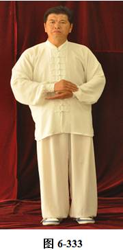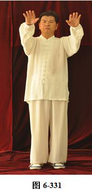 接上式,腰上提往左旋转,身体随向左转动,眼神也同时随之向左看。挤式不变,跟随身体也向左转至正南,向上方插掌,右脚随之内转,脚尖朝向正南;腰微拱,插掌的两臂顺势向下採,重心落至右腿,呈微倚式;腰向右外旋传,面侧向西北。两臂随之翻转向右后,左手掌脱离右手腕,两掌指尖斜指向地面,两掌心朝下; 左腰上提,左脚提起,向左外开,脚尖朝向正南,与左肩垂直平行。右腰同时上提向左转,两臂随向左划大平弧,摆向正南,呈左弓步; 腰随之后拱向左外撑,重心移至右腿,两臂继续划圆,随重心转移后坐,收之腹前。左手里旋翻,手心朝上,两掌心相对合在一起(见图6-329至6-336)。腰微拱旋转向右,两掌相合的右肘也随之微转, 稍斜向西北,打出右边肘;腰回转微含,随之上提,右臂顺势向右外打开,右掌变勾手,向右上方平送,略高于右肩,左手仍置胸前; 腰微拱向左外转,提左膝,左脚向左前上方迈出一大步,脚尖朝向东南。 身体随转面向东南,右脚随之内转。左腰继续上提,左臂随之掤出,成左弓步。腰微拱,身体稍后倚 将掤出左掌顺势内旋翻,掌心向下採按至腹前。腰随即上提,左掌顺势向左前上方推出。