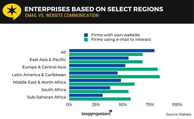根据Statista的数据报告显示, 全球特定地区的68%的企业使用电子邮件与客户沟通。79%的企业以某种方式使用其网站与客户进行沟通。电子邮件主要被拉丁美洲和加勒比地区使用,84%的企业使用电子邮件与客户和供应商沟通。欧洲和中亚地区有82%的企业也使用电子邮件进行沟通。南亚地区使用电子邮件最少,只有54%的企业通过电子邮件进行沟通。