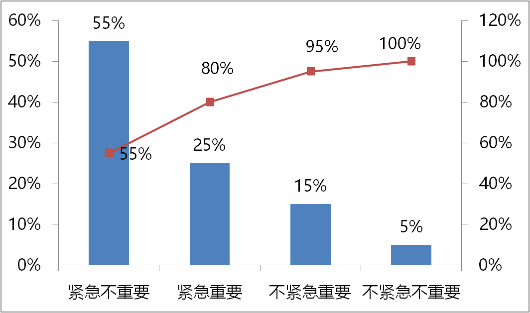A类事件紧急又重要,如有限期的计划、管理危机、安全事故、客户投诉等;B类事件不紧急但很重要,如公司战略形成、建立新型的人际关系、企业人才培养、学习新技能、保持身体健康等;C类事件不重要但很紧急,如接待不速之客、接电话、出席一些会议、写一些报告等;D类事件既不紧急又不重要,如看报纸、看电视连续剧、闲聊等。