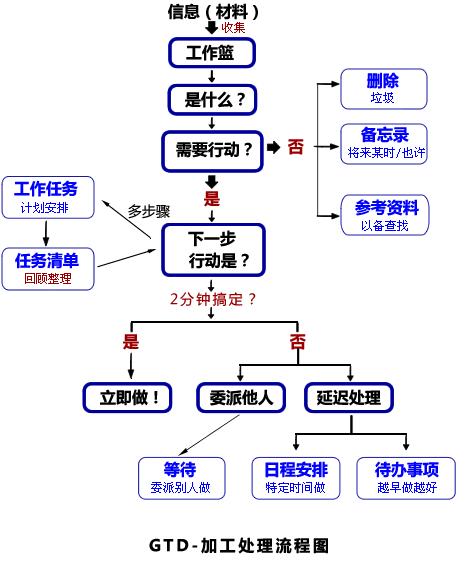 GTD(Getting Things Done),翻译过来就是“把事情做完”,是一个管理时间的方法。这个工具在时间管理的领域拥有极高的影响力,可以说是一个一整套方法工具的集合,属于时间管理的高级工具。其包含五个阶段: