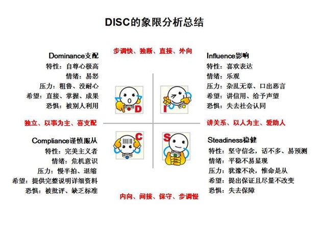 支配指挥型 (Dominance) | 果断、独立、有能力、热情、审慎的、 有作为 | 有目光接触、 有目的,说话快且有说服力,语言直接,使用日历、计划 |