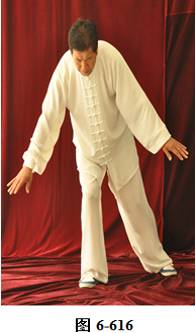 接之式,腰后拱,成后倚坐式,重心渐渐移至右腿上,左脚内转,脚尖朝向正南,身体亦转向正南;左腰上提,重心随即转向左腿上;右腰向右上提,随即右腿向右外上方开步,两臂随之外旋向两侧打开,与肩平行,两手心向下;左腰向右上提,重心随之渐渐移向右腿,两臂随之下垂,左臂置于左膝外侧,右臂落至与右膝垂直;左腰微提,左臂与左腿同时向右并拢,成蹲式。左右两臂交叉, 左手臂在上,两手心向下;腰上提,身体直立,两臂随身体直立, 呈十字,两掌翻转,手心朝外,眼神平视。(见图6-615至6-618)