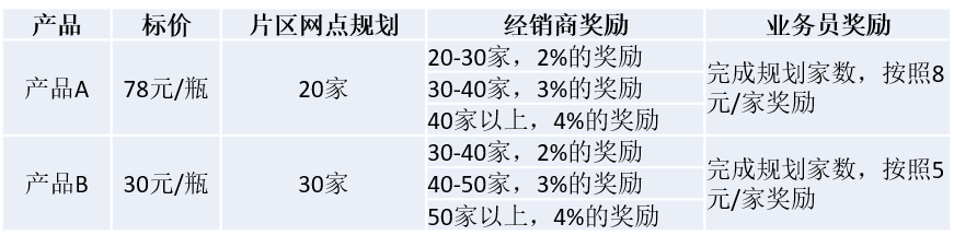 (3)此外,为了解决经销商及业务人员铺货的积极性的问题,快速实现产品铺货,在将各产品规定的铺货家数分片区划分到责任业务人员的同时,针对经销商可以给予网络建设奖(完成规定铺货网点数,分坎级按照回款金额给予奖励),针对业务人员分产品、按铺货家数给予现金奖励,如表5-1所示。