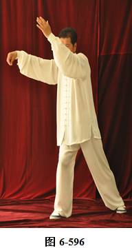 接上式,腰向右外上提,身体右转侧向西南并稍前俯,右脚脚尖外开,朝向西南,重心移至右腿,右腿屈膝下蹲。左手随前臂外旋,向右上划弧绕转至右肩前,手指向正西,左腿伸直,向左外转脚跟。右勾手臂随转体,朝向西南;腰向后旋拱回转,身体向左回转,左脚尖向左外转朝向正东。右脚尖向里转,朝向正东。左手臂随身体渐向下向左回转,下落经裆前沿左腿内侧,向前上方划弧穿伸,指尖朝前上方,掌心向右。右勾手向回后划弧,落至右胯侧, 勾手尖朝上。左腿屈膝前弓,右腿渐渐蹬展(见图6-596至6-597)。