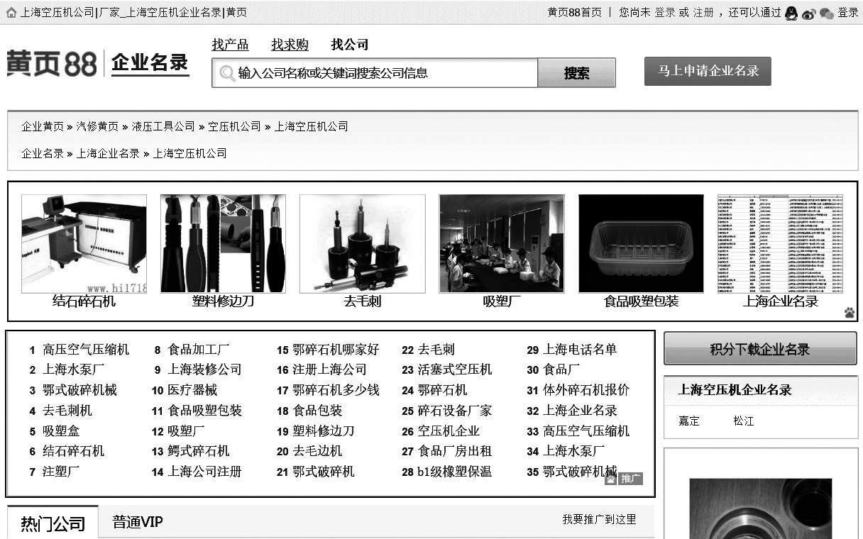 读了这段内容,我由衷感叹:网盟真的是无比强大。而且大多数人和我一样也能体验到,当浏览第三方平台时,网盟广告总是“如影随形”。如图3-5所示,我在一个小型的B2B门户网站(黄页88)上寻找上海空压机厂时,看到的网页截图,中间两块用黑线框起来的部分都是百度网盟广告,注意黑框里的右下角都有百度的熊爪图标。网盟广告中的关键词的确是我最近在百度上搜索过的关键词。