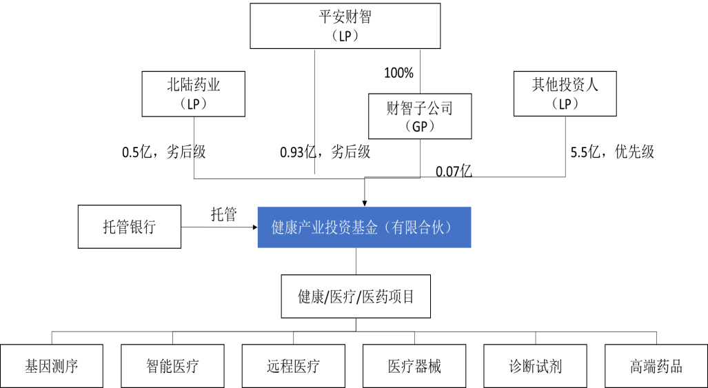 如图4-4所示,北陆药业与平安财智及其子公司作为共同劣后,由平安财智子公司负责募集优先级资金。基金规模7亿元,存续期5年(2年投资期、3年退出期)。存续期可延长两次,每次一年。