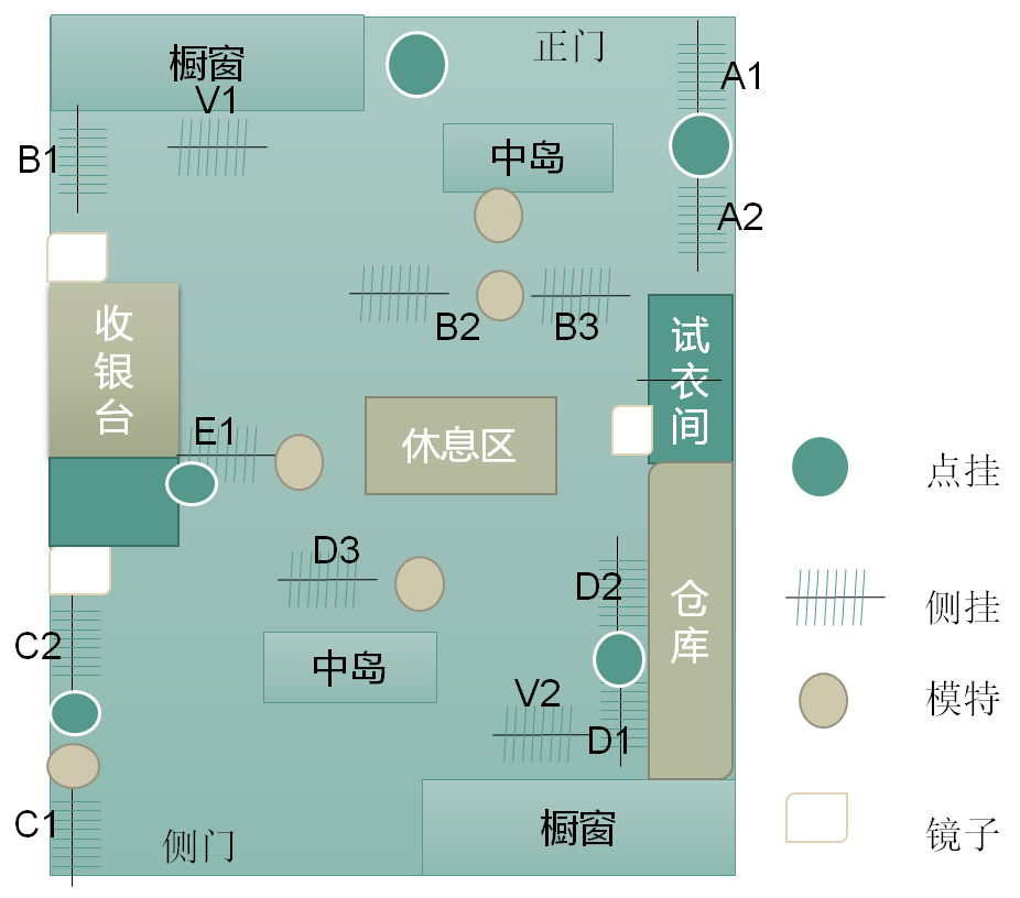 计算出店铺首批SKU的数量:对于线下买手店而言,买手组货的首批SKU数量需要根据店铺的布局来计算,首先要做好店铺的布局规划,确定好龙门架的数量及位置。如图6-2店铺的平面图,店铺里规划13个龙门架,一个中岛货架。