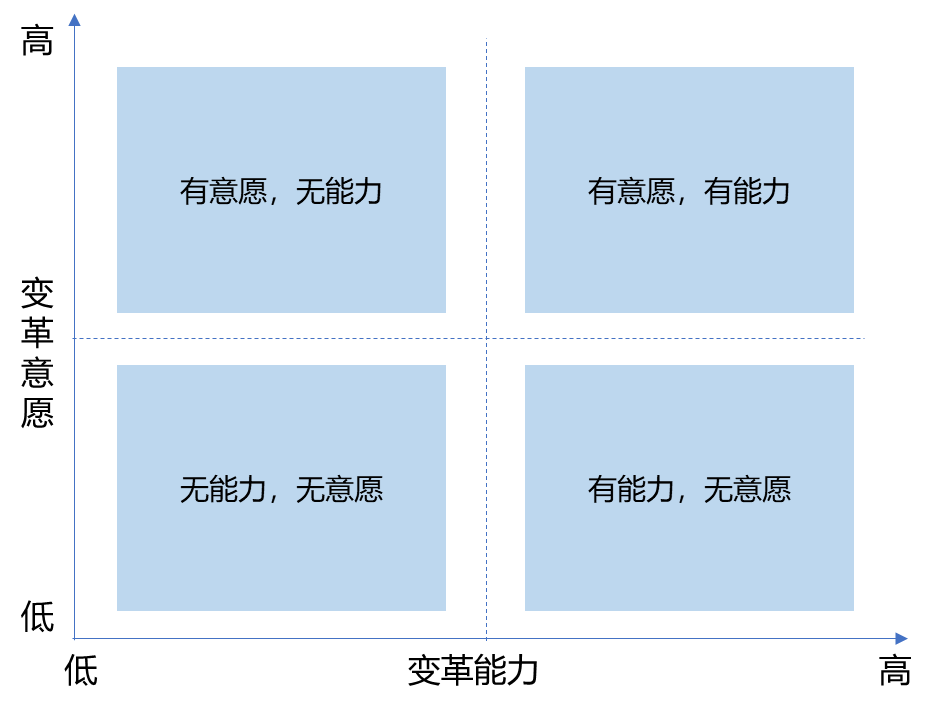 变革中的人员和形势虽然复杂,但影响人们行为的主要有两种因素:一是意愿;二是能力。因此,企业可以根据意愿和能力两个维度进行利益关系人分析:对有能力、有意愿的,鼓励其参与变革,大胆去闯,成功之后,公开奖励,并作为标杆案例宣传推广;对有意愿、无能力的,加强培训、帮带,给予一定的适应时间;对有能力、无意愿的,通过持续宣导,以及领导、同事的沟通交流,帮助其转变认识;对无意愿、无能力的,先说服帮带,转变困难的,要考虑调整岗位,甚至淘汰。如图14-2所示。