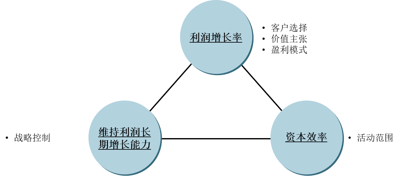 业务设计包括5个要素(有些企业在应用BLM时增加“风险管理”维度),它的背后的逻辑是:一家企业要赢得长期优势,必须考虑三个因素:利润增长率、资本效率及维持利润长期增长的能力。客户选择、价值主张、盈利模式等因素影响了利润增长率,活动范围(合伙伙伴)影响了资本效率,而维持利润长期增长能力则由战略控制点来施加影响,如图12-2所示。