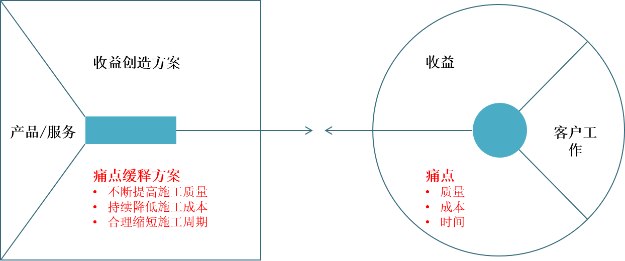 “客户选择”是指我选择服务什么客户,而“价值主张”是指客户为什么选我,我的价值到底是什么。P公司发现,在施工过程中的痛点主要是质量、成本和时间。因此,价值主张应该聚焦于解决客户的需求和痛点。如图12-3所示。