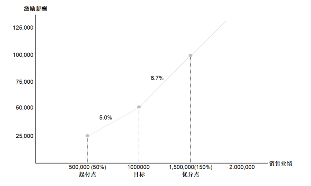 企业可以使用包含多个加速器的多级激励薪酬结构。在这种结构里,每个梯级的销售业绩对应更高的激励薪酬,以此鼓励销售人员达到更高的绩效水平。图9-4为一个使用多个加速器的佣金型销售薪酬激励计划。计划的起付点为50万元,销售人员的业绩达到起付点时,可以获得2.5万元激励薪酬。50万~100万元的业绩区间内,销售佣金比例为5%,销售人员完成100%业绩目标时可以获得5万元的激励薪酬。超过100%业绩目标后,佣金比例上升为6.7%,销售人员达到优异点时,可以获得10万元的激励薪酬。