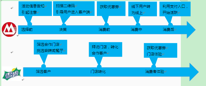 招商银行在全国合作餐饮门店推出,每周三在指定餐饮门店点购指定菜品刷招商银行信用卡、一卡通金卡、金葵花卡享五折优惠活动。招商银行客户端需要线下引流。可口可乐与招商银行达成一致,通过下载招商银行客户端,获得优惠券,在指定门店兑换1瓶1.25L雪碧, 指定门店必须是有售卖可口可乐系列产品、口味麻辣咸的餐厅。 招商银行在全国线下有一定的活跃餐饮门店体量,同时地推人员也在加大与各餐饮门店的结合推送该活动。
