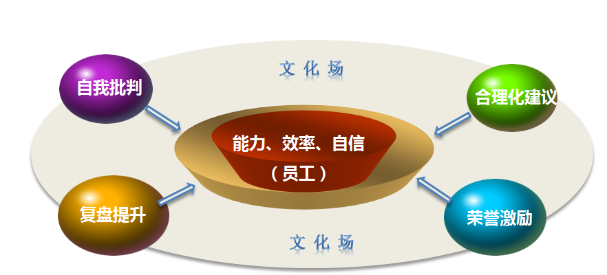 以价值观为基础,确定管理优化的核心理念,打造管理优化的文化场,提高员工的能力、效率和自信,是管理优化平台的另一个目标。