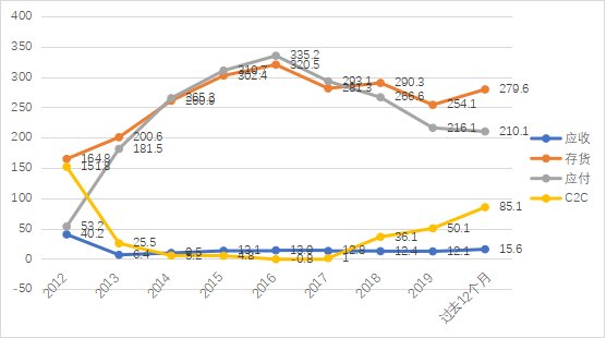 在2012年开始,海澜之家的供应链有了明显的指标改善,C2C从151.8天开始大幅明显改善到25.5天,在最高峰的2016年甚至C2C表现为-0.8,也就是意味着海澜之家向供应商支付款项的接近1天前就从产品销售中收集了资金,即它无须在承担债务的情形下获得可观的财务栱杆。
