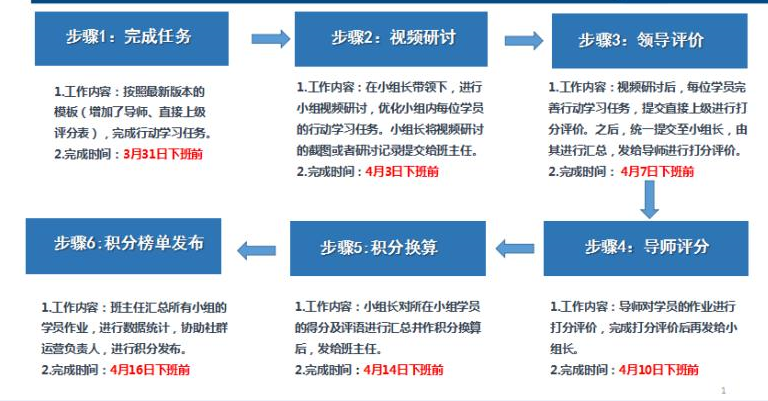 第一阶段的学习任务即将接近尾声,包括4次线上课、1项行动学习任务、1次学习心得,请各位学员及时关注自己的任务完成情况。学习心得完成时间为截至4月5日,其中关于行动学习任务需要特别强调,完成时间截至3月31日,4月3日前小组长组织学员进行行动学习任务的沟通研讨,再提交直接领导、导师进行评估及后续的统计分数(具体流程如图11-10所示)。