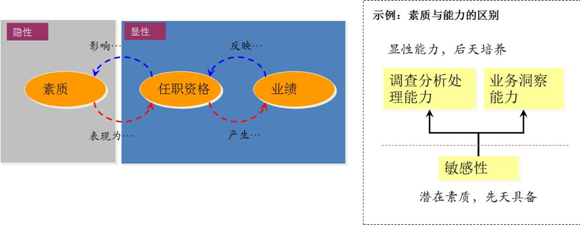 一般来讲,显性能力定义为“任职资格”,隐性能力定义为“素质”。二者之间的关系如图4-4所示: