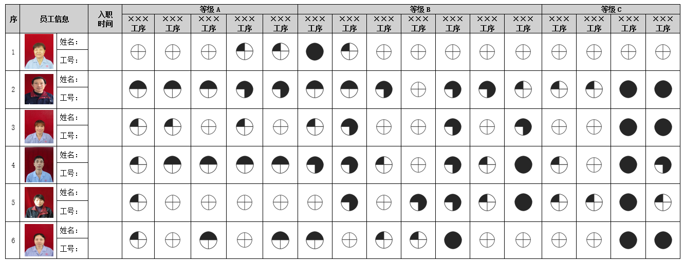 在开展多能工技能的时候,必须要用一个图形来表示该员工对该技能掌握的程度,一般的情况下,是用一个圆形来表示。