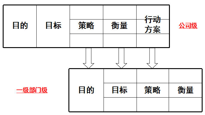 在确定了公司级的战略后,一级部门级战略则是根据公司级战略来制定的。各部门的目的和目标需要与公司整体战略保持一致,同时也会根据自身的业务特点和资源情况制定具体的策略。这些策略通常是中短期行动计划,旨在为实现部门目标提供具体操作方案。部门级的衡量指标则是针对其策略而设定的,用于评估部门绩效和战略目标的实现程度。