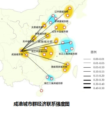 从城市群经济联系强度图可以看出,成渝城市群与长江中游及中原城市群联系相对密切。