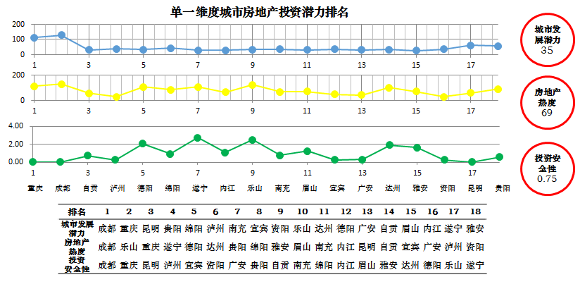 我们从城市发展潜力、房地产市场热度、投资安全性三个单一维度给出城市群各城市排名情况如下图: