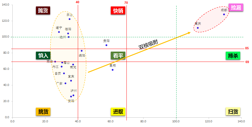 核心城市成都、重庆(主城九区)处于捡漏区:成都热度远远高于重庆(主城九区),且城市基本面也好很多,对此两城市的发展策略应有所不同,成都应以其外溢区域为主,重庆应坚守主城区;一般城市大多处在挑货区和抛货区,短期内的发展速度和潜力不大。