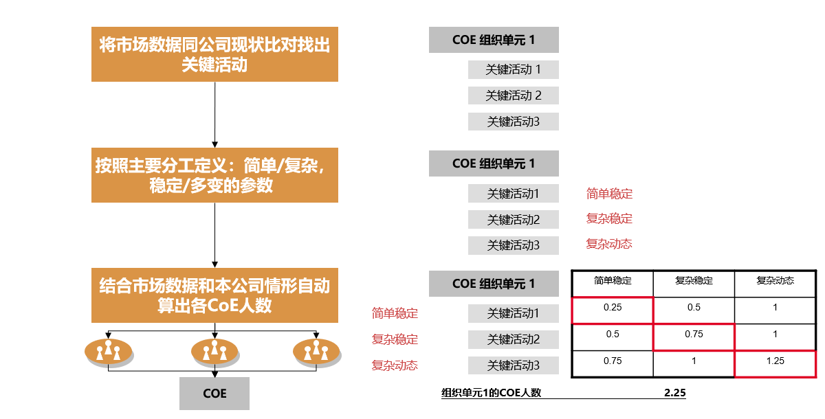 (3)结合市场上的数据和本公司的活动难度,把每个活动所需的人头列出来,加总后就是这个工作板块所需的CoE人数。比如以上薪酬CoE的人头划分,有三个关键活动:活动1是薪酬计算方法设计,活动2是对外薪酬对比和调整本公司薪酬政策,活动3是高管及关键人才短期和长期激励制度和流程设计。对比外部的数据,这三个活动所需的人数是0.25、0.75和1.25,这样加总后得到的薪酬CoE的人数是2.25个人头。