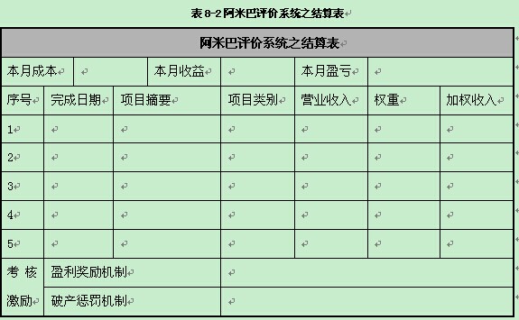 阿米巴评价系统之结算表、阿米巴评价系统之项目库和阿米巴评价系统之级别加权说明分别如表8-2、8-3、8-4所示。