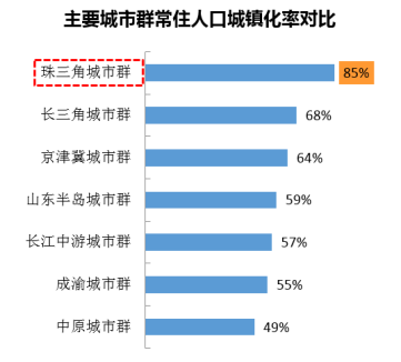 目前,珠三角城市群常住人口城镇化率为85%,高于我国常住人口城镇化率57.4%。珠三角城市群中,深圳、佛山、东莞的城镇化率较高,分别100%、94.95%、88.8%。