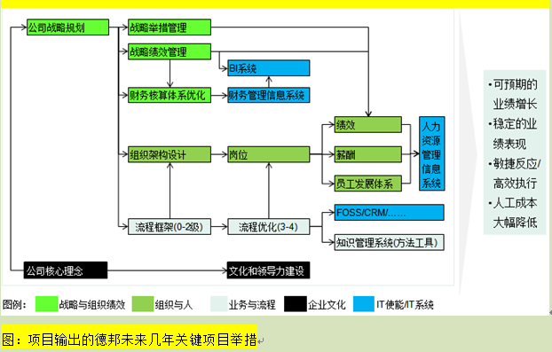 虽然项目中提出的2015年实现270亿收入的目标后来被德邦修正,但作为德邦与世界知名咨询公司合作的第一个公司级大型咨询项目,它明晰了德邦未来发展的战略路径,尤其是描绘出了德邦未来咨询项目开展的蓝图。不仅项目输出的16个公司级项目在德邦一一得到了落实,还同时奠定了德邦与咨询公司大规模合作的基础。此后数年间先后与麦肯锡、安永咨询公司、美世人力资源咨询公司等世界级咨询公司,在经营、运营、人力、财务、IT等各领域展开了深度合作,并取得了丰硕的成果。