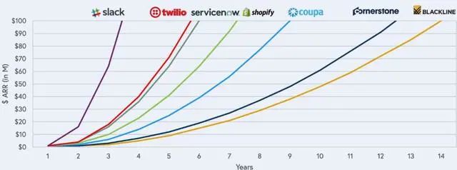 下图,如6-2所示,列举了若干海外企业云服务公司ARR(年度经常性收入)从100万美金增长到1亿美金所花费的时间,可以看到有意识采用增长驱动的公司往往成长更快,比如Slack只用3年时间就做到了1亿美金的ARR。