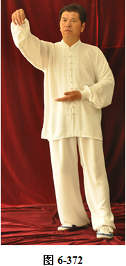 接上式,腰上提向左旋转,身体随向左转动,眼神随之向左看。挤式不变,随身向左转至正南,向上方穿掌, 右脚随之内转, 脚尖朝向南; 腰微拱,穿掌的两臂顺势向下採,重心落于右腿,呈微倚式; 腰向右外旋转, 身体稍侧向西北, 两臂随之翻转向右后,两掌指尖斜指向地面,掌心朝下。左掌落置右肋旁,右臂舒伸直落置右胯后侧;左腰上提,左脚外开,脚尖转向正南,与左肩平行;右腰上提,带动两臂平弧向正南,成左弓步;腰向左拱撑,两臂向左下划大平弧,重心移至右腿;两臂继续向下划弧,随重心转移后倚收回腹前,呈两掌相对微合在一起(见图6-367至6-377)。腰微拱旋转向右,身体带右肘随之微转向稍西北,打出右边肘;腰回转微含,随之上提,右臂顺势向右外斜上方平送打开, 右掌变勾手,略高于肩。左手仍置腹前;左腰微拱向左外转,提左膝, 左脚向左前上方迈出一大步,身体转向正东。左腰继续上提,左臂随之向前掤出。右脚随身内转,脚尖朝向东南,呈大左弓步;腰微拱,身体稍后倚,将左掤出的手掌顺势向内旋翻,掌心向下採按至腹前。腰随即上提,左掌随向左前上方掤推。