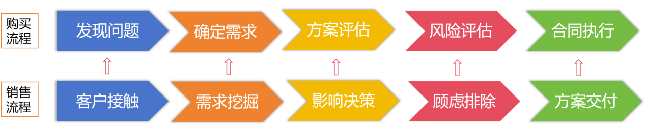 同理,当客户在进行大订单购买的时候,同样会经历发现问题、确定需求、方案评估、风险评估、合同执行五个阶段。作为销售人员,与之相对应,我们的销售流程会分为客户接触、需求挖掘、影响决策、顾虑排除、方案交付五个阶段,其相互对应关系如图2-1所示。