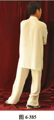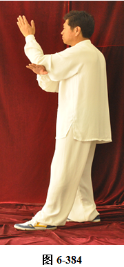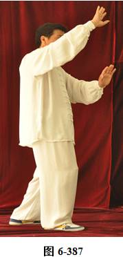 接上式,腰后拱微倚,两手臂随腰向里捋转,左小臂直立,掌心朝向右外,右小臂回收至左臂肘下,呈托肘状,右手心朝下。左脚尖里转向北,腰微右转,重心移向左腿;腰微含,右脚随向东南由脚跟迈出一步。腰微拱,重心移落右腿,随之转腰身体朝向东南, 左脚尖向里转朝向正东。两臂随身体转向东南,顺势向下划弧圆撑, 两掌指相对,掌心朝里,重心移落左腿;腰微拱上提,重心转移至右腿,身体前移,两臂向前掤;腰微含下沉,重心微移,两臂翻转。腰上提右脚向东南垫步,随即右臂上举至超过头顶,手腕旋转掌心向外架于右外额前。身体微前移,重心落于右腿上,呈右弓步。左手掌由胸前旋翻向东南方推出,眼神平视(见图6-383至6-387)。