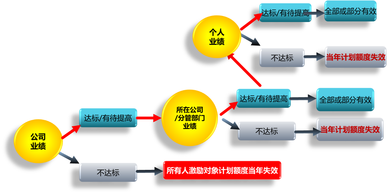 激励对象个人当期实际可行权数量=当期计划行权数量×公司业绩考核对应行权系数×激励对象所在部门/分子公司绩效考核对应行权系数×激励对象个人业绩对应行权系数