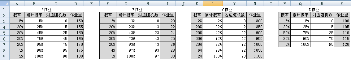 对于A、B、C、D四项作业的作业量的可能值及其概率,下面基于Excel电子表格介绍蒙特卡罗模拟的步骤和结果。