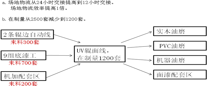 (1)一个产品大约由20块不同的板件组成,其中真正工序时间长的板件只有门板部件,涂装工序喷涂后需要待干,而且返工极多,压缩生产周期很困难。项目组转化了1个思路,将A类产品根据预估的销量,单独针对门板部件额外的设定了在制品库存3天,从而压缩了A类产品的涂装车间的交付周期时间。